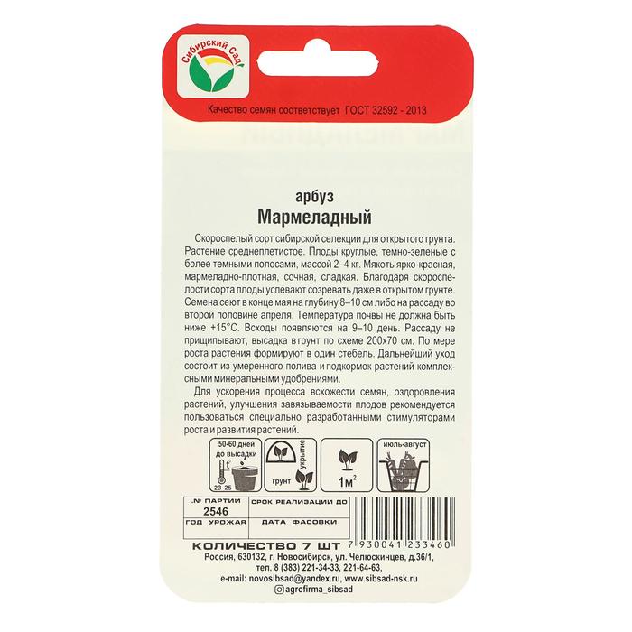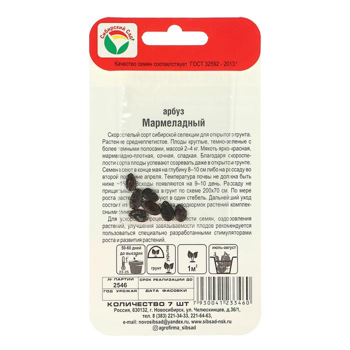 Свежесть вкуса, сочная прохлада! Раннеспелый (62-86 дней) сорт с плодами отличных вкусовых качеств и ярко выраженным арбузным ароматом. Плоды округлые, с темно-зелеными полосами, массой 2,5-4 кг. Мякоть ярко-красная, сладкая. Сорт отличает дружное формирование урожая, хорошие транспортабельность и лежкость. Хорошо растёт на песчаных и супесчаных почвах. Избыточно влажные почвы не пригодны. Участок должен быть хорошо про-греваемым и освещённым, защищённым от ветров. На прежнем месте можно выращивать по истечении 4 лет. Посев производят, когда почва прогреется на глубину 8-10 см до 15°С. Перед посевом семена обрабатывают в растворе марганцовокислого калия, затем промывают чистой водой. В случае рассадного способа выращи-вания, рассаду высаживают, когда минует угроза заморозков, в возрасте 3-4 настоящих листьев. В открытый грунт арбуз высаживают по схеме 140х100 см, в теплицы —70х70 см с использованием шпалер.