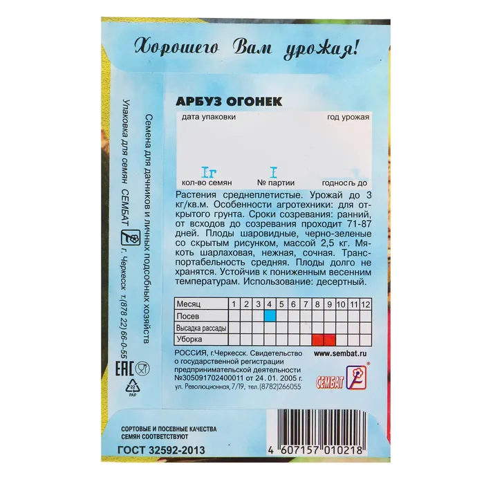 Почва под арбузы может быть суглинистая или супесчаная по механическому составу. Должна хорошо пропускать влагу и воздух. Высевают семена во второй декаде апреля-первой декаде мая. Высаживают рассаду в грунт через 30-35 дней после посева (в конце мая-начале июня). Придерживаются такой схемы посева: 100х60 см. Стебель подвязывают к шпалере. Снизу обрывают боковые побеги (до высоты 50 см). Те, что выше – прищипывают над 1-3 листком. Поливают умеренно, особенно когда начинают созревать плоды. Почву перерыхляют 2-3 раза за вегетационный период. Удаляют сорняки. При необходимости вносят подкормки. Собирать урожай начинают со второй декады августа и заканчивают до 15 сентября.