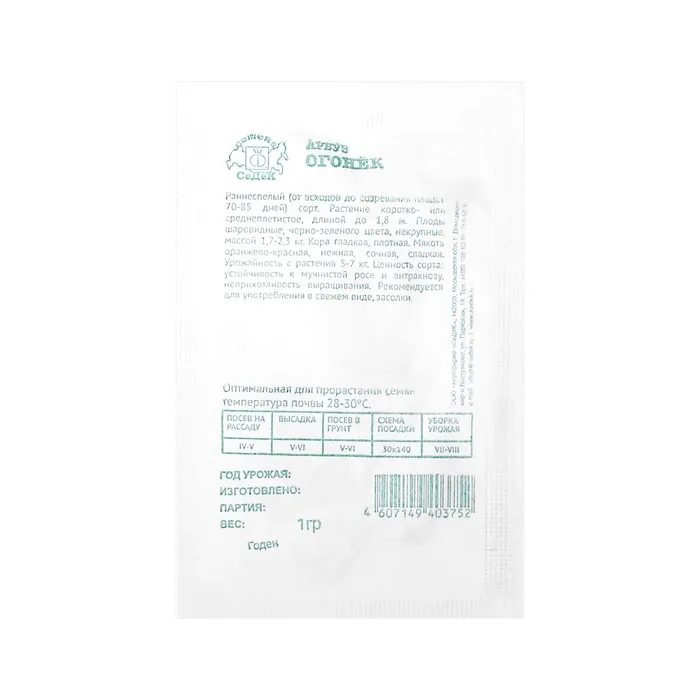 Раннеспелый (период от полных всходов до первого сбора плодов 71-87 дней). Растение коротко- или среднеплетистое. Длина главной плети не превышает 1,8 м. Стебель тонкий, округлой формы, слабоопушенный. Лист мелкий, сильнорассеченный, с узкими долями. Плод шаровидный, небольшой, массой 1,7-2,3 кг. Поверхность плода гладкая или слегка сегментированная. Окраска черно-зеленая со скрытым рисунком. Кора тонкая, хрупкая. Мякоть оранжево-красная, нежная, сочная, сладкая. Вкусовые качества хорошие. Предназначен для выращивания в пленочных теплицах и в открытом грунте. Посев на рассаду в конце апреля. Срок выращивания рассады 30-35 дней, высадка - в конце мая – начале июня. Растения подвязывают к шпалере, до высоты 50 см удаляют все боковые побеги, последующие прищипывают над 1-3 листом. Возможно выращивание в свободной культуре в расстил. Полив умеренный, особенно в период созревания плодов. Товарная урожайность 2-3 кг/м2. Относительно устойчив к антракнозу, в средней степени поражается мучнистой росой. Схема посадки 70х150 см.