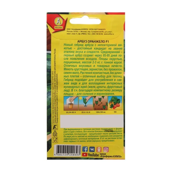 Новый гибрид арбуза с неповторимой мякотью – достойный кандидат на звание эталона вкуса и сладости. Среднеранний – первый арбуз созреет через 85-95 дней после появления всходов. Плоды округлые, порционные, массой 2-3 кг, с тонкой корой. Отличных вкусовых и товарных качеств. Мякоть хрустящая, зернистая, без прожилок, семян мало. Растения компактные, без длинных плетей – отличный выбор для теплиц. Гибрид подойдет для употребления в свежем виде и для воплощения интересных кулинарных идей (желе, цукаты, фруктовый лед). В т.ч. благодаря компактному размеру плодов – для соления и маринования.Посев на рассаду в начале мая. Высадка рассады в открытый грунт в конце мая – начале июня (через 30-35 дней после всходов, в фазе 3-4-х настоящих листьев). Схема посадки 100х100 см. В южных регионах можно выращивать путем прямого посева в грунт в апреле-мае. При выращивании под пленочными укрытиями растения формируют в один стебель (удаляют все боковые побеги до высоты 50 см, последующие прищипывают над 1-3 листом), подвязывают к шпалере (плоды нужно подвешивать в сетках). Возможно выращивание в свободной культуре в расстил.