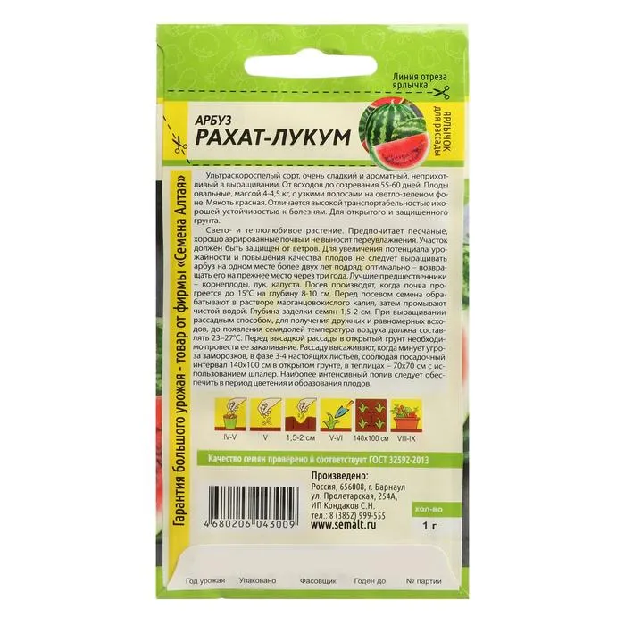 Ультраскороспелый сорт, очень сладкий и ароматный, неприхотливый в выращивании. От всходов до созревания 55-60 дней. Плоды овальные, массой 4-4,5 кг, с узкими полосами на светло-зеленом фоне. Мякоть красная. Отличается высокой транспортабельностью и хорошей устойчивостью к болезням. Для открытого и защищенного грунта. Свето- и теплолюбивое растение. Предпочитает песчаные, хорошо аэрированные почвы и не выносит переувлажнения. Участок должен быть защищён от ветров. Для увеличения потенциала урожайности и повышения качества плодов, не следует выращивать арбуз на одном месте более двух лет подряд, оптимально – возвращать его на прежнее место через три года. Лучшие предшественники — корнеплоды, лук, капуста. Посев производят, когда почва прогреется до 15°С на глубину 8-10 см. Перед посевом семена обрабатывают в растворе марганцовокислого калия, затем промывают чистой водой. Глубина заделки семян 1,5-2 см. При выращивании рассадным способом, для получения дружных и равномерных всходов, до появления семядолей температура воздуха должна составлять 23–27°C. Перед высадкой рассады в открытый грунт, необходимо провести ее закаливание. Рассаду высаживают, когда минует угроза заморозков, в фазе 3-4 настоящих листьев, соблюдая посадочный интервал 140х100 см в открытом грунте, в теплицах —70х70 см с использованием шпалер. Наиболее интенсивный полив следует обеспечить в период цветения и образования плодов.