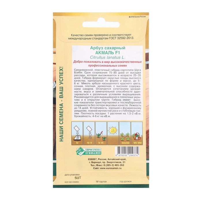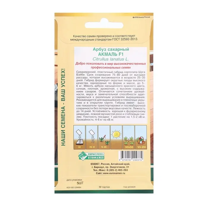 Срок созревания 75-80 дней от высадки рассады. Рассада высаживается в возрасте 25-35 дней. Гибрид формирует округлые плоды высокого качества, однородные по форме и массе, до 5-6 кг. Мякоть насыщенно-красного цвета, сочная, плотная, ароматная, с высоким содержанием сахаров. Отличное сочетание урожайности, вкуса и замечательной способности адаптироваться к различным условиям выращивания! Рекомендуется для выращивания в пленочных укрытиях и в открытом грунте. Гибрид имеет высокие показатели транспортабельности и послеуборочной сохранности без потери вкусовых качеств. Лежкость до 14 дней. Гибрид устойчив к фузариозному увяданию, ложной мучнистой росе, стеблевой гнили. Плотность посадки 1 растение/1,5-2 м2. Урожайность 4-6 кг/м2.