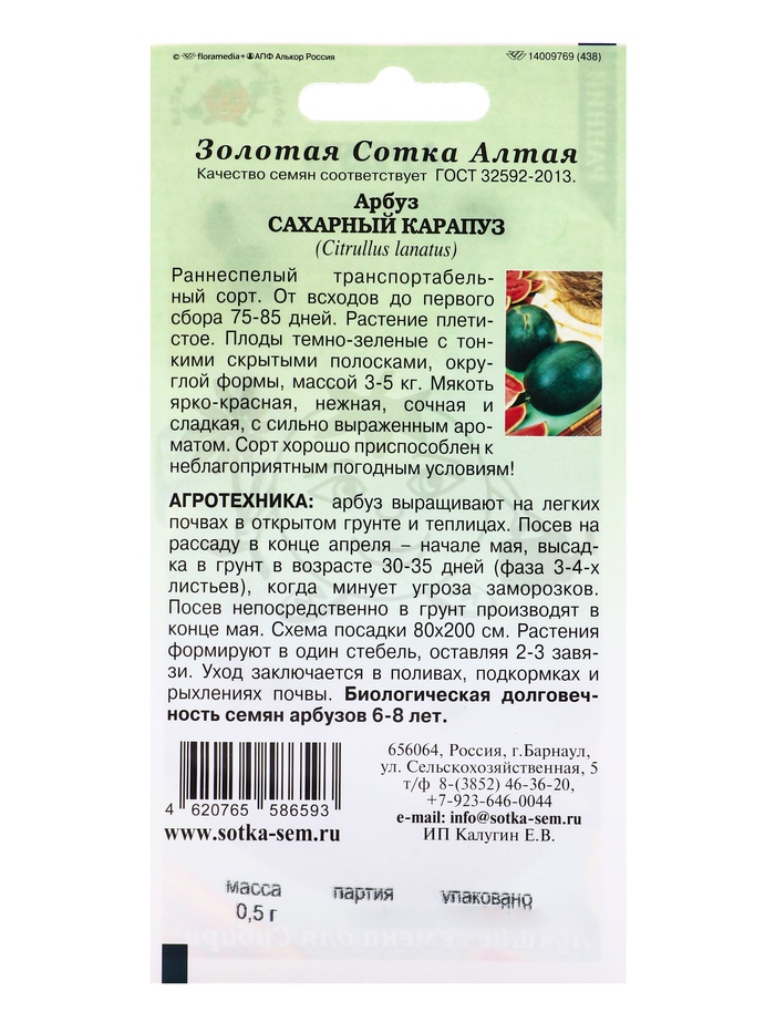 Семена Арбуз «Сахарный Карапуз», 0.5 г, раннеспелый, «Золотая Сотка Алтая» — Характеристики