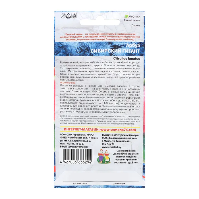 Великолепный, холодостойкий, стабильно урожайный сорт для открытого и защищенного грунта. Плоды огромные, округлые, зеленые, с темно-зелеными шиповатыми полосами, массой до 7 кг. Мякоть плотная, красная, нежная, сочная, очень сладкая. Семена мелкие, коричневые, крапчатые. Сорт отличается превосходными вкусовыми качествами, хорошей транспортабельностью, лёжкостью.Посев на рассаду в начале мая. Высадка рассады в открытый грунт в конце мая – начале июня, в фазе 3-4-х настоящих листьев.Схема посадки 100х100 см.В южных регионах можно выращивать путем прямого посева в грунт в апреле – мае. При выращивании под пленочными укрытиями растения формируют в один стебель (удаляют все боковые побеги до высоты 50 см, последующие прищипывают над 1-3 листом), подвязывают к шпалере.Для хорошего роста и обильного плодоношения растениям необходим своевременный полив, регулярная прополка, рыхление и подкормка минеральными удобрениями.