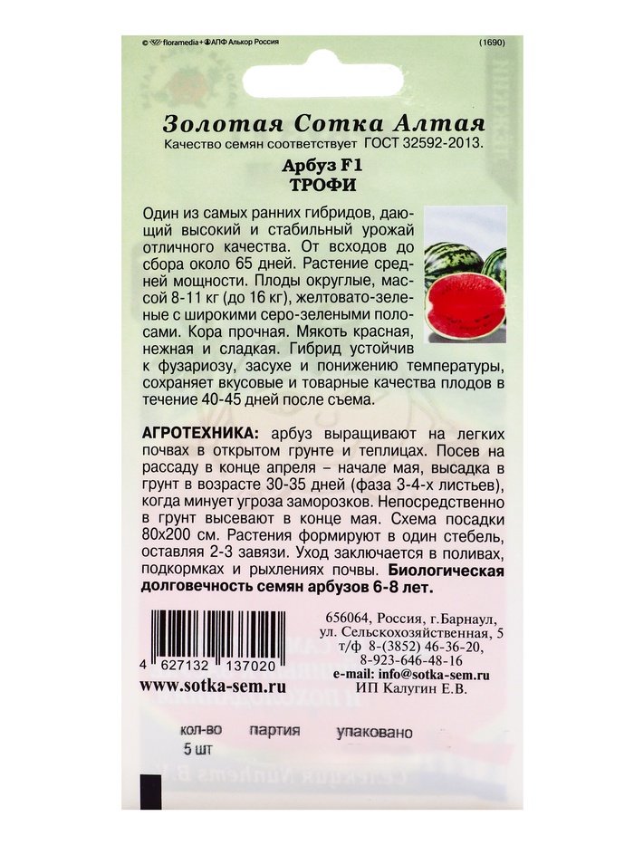 Семена Арбуз «Трофи», F1, 5 шт., ультраранний, «Золотая Сотка Алтая» селекция Nunhems B.V. — Характеристики