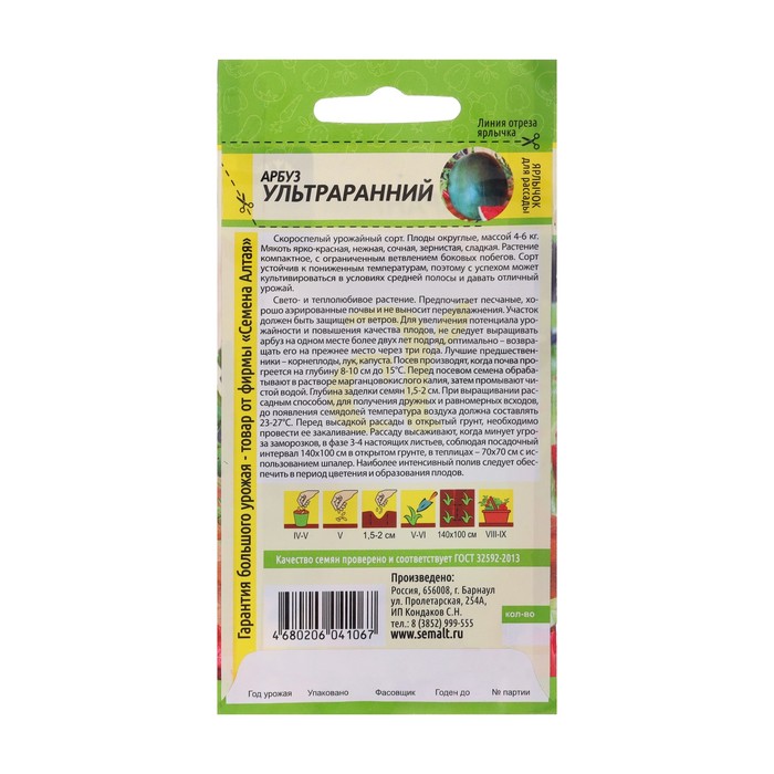 Ультраскороспелый сорт, очень сладкий и ароматный, неприхотливый в выращивании. От всходов до созревания 55-60 дней. Плоды овальные, массой 4-4,5 кг, с узкими полосами на светло-зеленом фоне. Мякоть красная. Отличается высокой транспортабельностью и хорошей устойчивостью к болезням. Для открытого и защищенного грунта. Хорошо растёт на песчаных и супесчаных почвах. Избыточно влажные почвы не пригодны. Участок должен быть хорошо прогреваемым и освещённым, защищённым от ветров. На прежнем месте можно выращивать по истечении 4 лет.