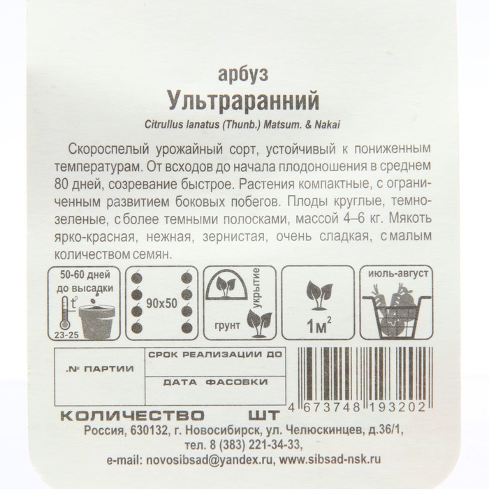 ПОСЕВ: в открытый грунт – в конце мая, на глубину 4-6см для мелкосемянных и 6-9см для крупносемянных сортов, по 2 семени в лунку. На рассаду – в конце апреля в емкости диаметром от 10см с увлажненным легким питательным субстратом. Рекомендуется замачивание семян в течение суток в теплой воде Т 30-35°С. Для нормального роста и развития растениям необходима Т 25-30°С днем и 18-20°С ночью. В период выращивания рассады рекомендуется провести две подкормки комплексным минеральным удобрением. Когда минует угроза заморозков, рассаду в возрасте 25-30 дней, в фазе 3-5-го настоящего листа высаживают в грунт по схеме 70-140х140см (в зависимости от сорта). Перед высадкой рассады в каждую лунку вносят 1,5-2кг компоста или перегноя и хорошо проливают, высаживают в полученную кашицу, засыпая с боков сухой почвой, чтобы не образовывалась корка. Высадка на гребни, рассаду арбуза нельзя заглублять.