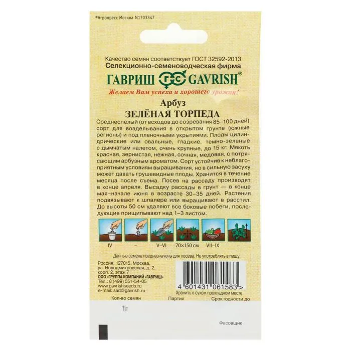 Среднеранний (85-95 дней от полных всходов до первого сбора плодов) сорт для выращивания в открытом грунте в средней полосе и на юге России. Растения средней мощности, главная плеть средняя. Плоды цилиндрические и овальные, окраска темно-зеленая с дымчатым налетом. Кора толстая и прочная, что положительно сказывается на лежкости и транспортабельности. Мякоть ярко-красная, сладкая, нежная. Масса плодов от 3,5 до 6,0 кг. Посев на рассаду производят в конце апреля. Высадку рассады в грунт— в конце мая – начале июня в возрасте 30-35 дней. Растения подвязывают к шпалере (до высоты 50 см), удаляют все боковые побеги, последующие прищипывают над 1-3 листом или выращивают врасстил.