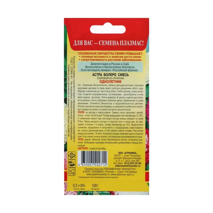 Семена Астра ""Болеро"" имеют широкую цветовую гамму, которая включает в себя различные оттенки красного, розового, фиолетового, белого и желтого цветов. Они также различаются по форме цветка - от простых до махровых, что позволяет создавать разнообразные композиции.