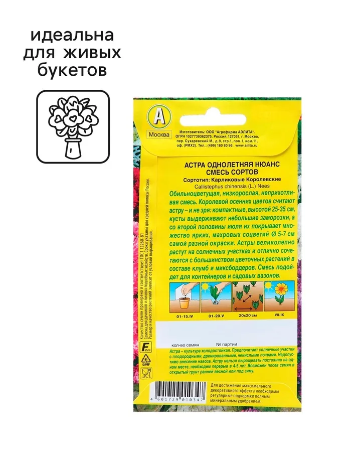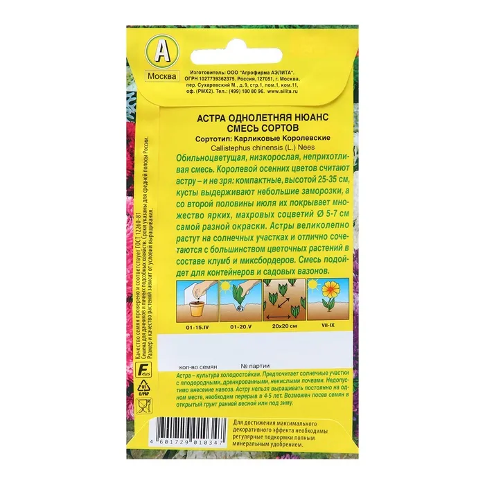 "Карликовая, компактная, долгоцветущая астра. Обильно цветет с августа до устойчивых заморозков. Куст полушаровидной формы, высотой и шириной около 30 см. Соцветия махровые, диаметром 5-7 см. Сорт приспособлен для выращивания в горшках. В садовых цветниках используется для оформления бордюров вдоль дорожек, клумб и рабаток.