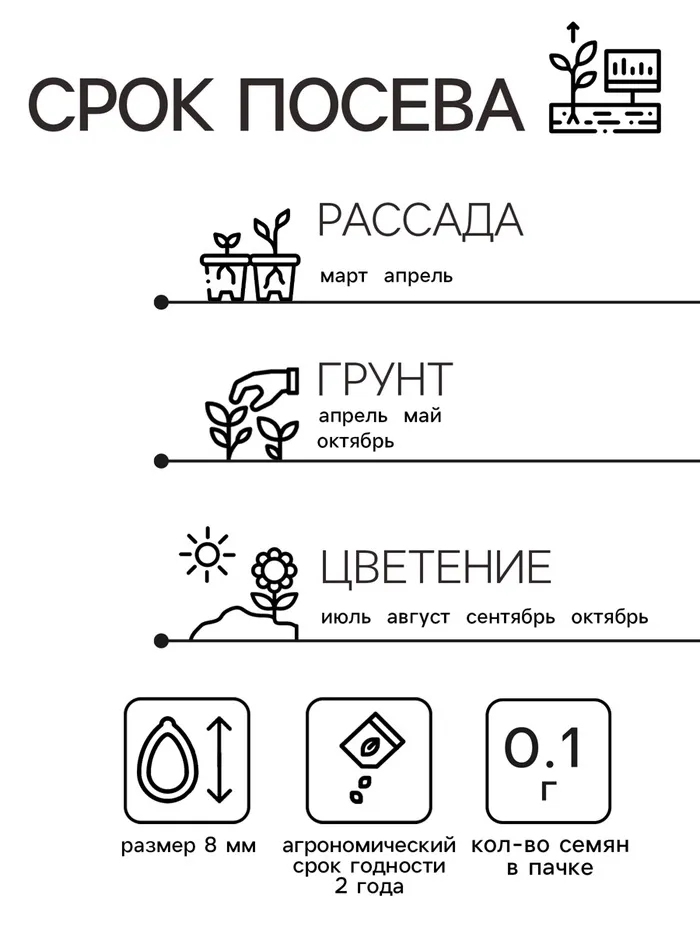 Семена высевают в марте-апреле, пикируют с развитием первой пары настоящих листочков по схеме 5х5 см, в открытый грунт рассаду высаживают с середины мая до начала июня.