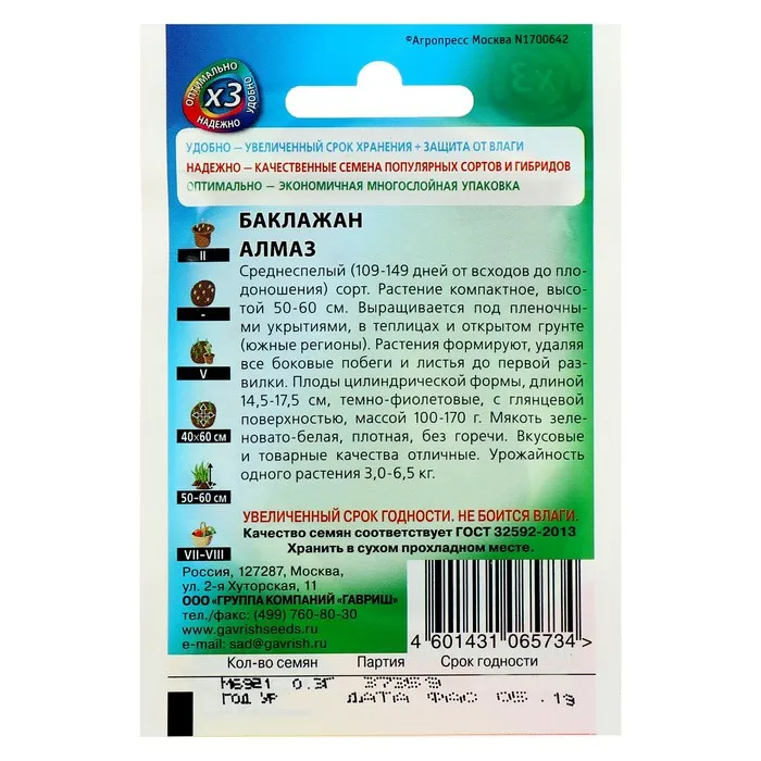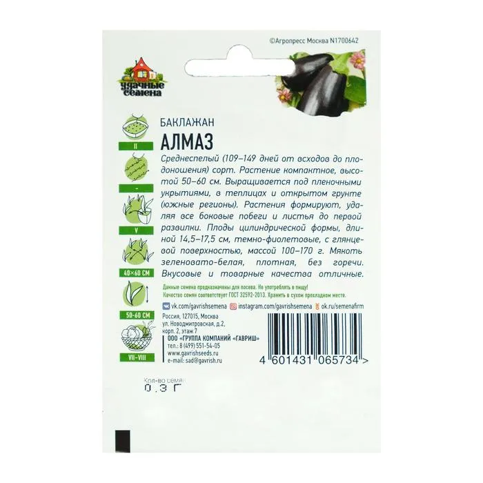 Среднеспелый (109-149 дней от всходов до плодоношения) сорт. Растение компактное, высотой 50-60 см. Выращивается под пленочными укрытиями, в теплицах и открытом грунте (южные регионы). Растения формируют, удаляя все боковые побеги и листья до первой развилки. Плоды цилиндрической формы, длиной 14,5-17,5 см, темно-фиолетовые, с глянцевой поверхностью, массой 100-170 г. Мякоть зеленовато-белая, плотная, без горечи. Вкусовые и товарные качества отличные. Урожайность одного растения 3,0-6,5 кг.