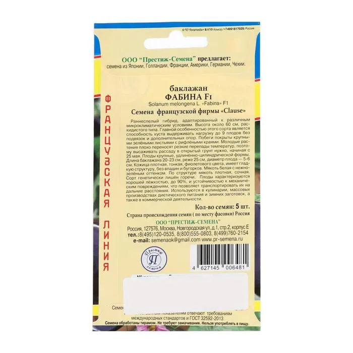 Высота около 60 см, раскидистого типа. Главной особенностью этого сорта является способность куста выдерживать нагрузку до 9 плодов без подвязок и дополнительных опор. Побеги покрыты крупными зелёными листьями с рифлёными краями. Молодые растения плохо переносят резкие перепады температур, поэтому высаживать рассаду в открытый грунт нужно, начиная с 25 мая. Плоды крупные, удлинённо-цилиндрической формы. Длина баклажана 20–23 см, реже 25 см, диаметр плода — 5–6 см. Кожица плотная, тонкая, фиолетового цвета, имеет гладкую структуру, без впадин и бугорков. Мякоть белая с нежно-зелёным оттенком. По структуре мякоть плотная, сочная. Сорт генетически лишён горечи. Плоды характеризуются хорошей лёжкостью, до 90%, и устойчивостью к механическим повреждениям, что позволяет транспортировать их на дальние расстояния.