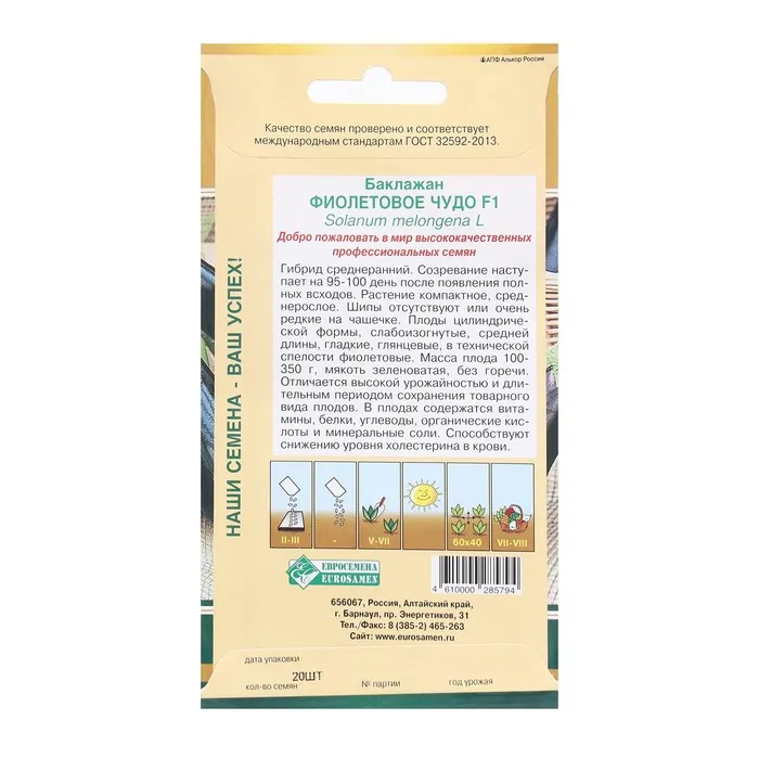 Баклажан Фиолетовое Чудо F1 - ранний гибрид для выращивания в открытом и защищенном грунте. От всходов до созревания 95–100 дней. Растение полуштамбовое, компактное, высотой 70–90 см. Листья зеленые, слабоопушенные. Баклажаны цилиндрические, темно-фиолетовые, блестящие, гладкие, длиной до 20 см, диаметром 4–6 см, массой 100–135 г. Отличается отсутствием крупных шипов на чашечке и более длинным периодом перехода от технической до биологической спелости. Мякоть плотная, зеленовато-белая, с приятным вкусом, без горечи. Баклажан Фиолетовое Чудо F1 устойчив к вертициллезному увяданию (Va, Vd), толерантен к повреждению паутинным клещом. Используется для консервирования, маринования, приготовления икры и домашней кулинарии. Предназначен для выращивания в открытом грунте и в теплицах. Густота посадки 5–6 растений/м2. Схема посадки 70х30 см. Урожайность до 8 кг/м2.