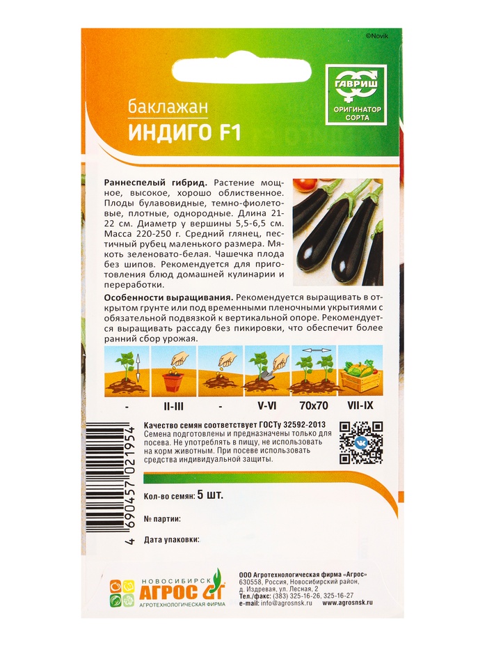 Семена Баклажан «Индиго», F1, 5 шт., «Агрос» — Характеристики