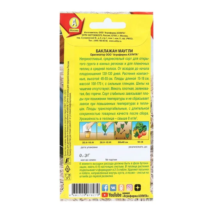 Неприхотливый, среднеспелый сорт для открытого грунта в южных регионах и для пленочных теплиц в средней полосе. От всходов до начала плодоношения 120-130 дней. Растения компактные, высотой 45-55 см. Плоды длиной 15-18 см, массой 100-170 г, с сильным глянцем. Шипы на чашечке отсутствуют.