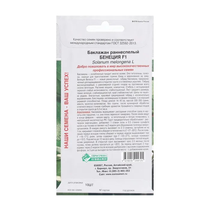 Баклажаны — излюбленный продукт многих хозяек. Они питательны, полезны, хороши для приготовления горячих блюд и маринования на зиму. Бенеция F1 - новый раннеспелый гибрид баклажана, предназначенный для выращивания в открытом грунте и в пленочных укрытиях. Гибрид высокоурожайный, с равномерной отдачей плодов на протяжении всего сезона вегетации. Растение мощное, компактное. Стебель с антоциановой окраской слабой интенсивности, слабоопушенный. Лист среднего размера, темно-зеленый, слабоморщинистый, край слабоволнистый. Шипы на чашечке редкие. Элегантный, красивый средне-ранний гибрид с исключительно выровненными, блестящими, каплевидными по форме плодами, с их хорошей укрывной способностью.