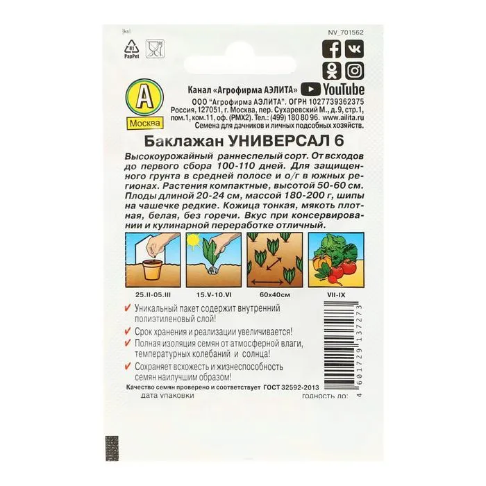Семена Баклажан «Универсал 6», Лидер 0,1 гр., — Характеристики