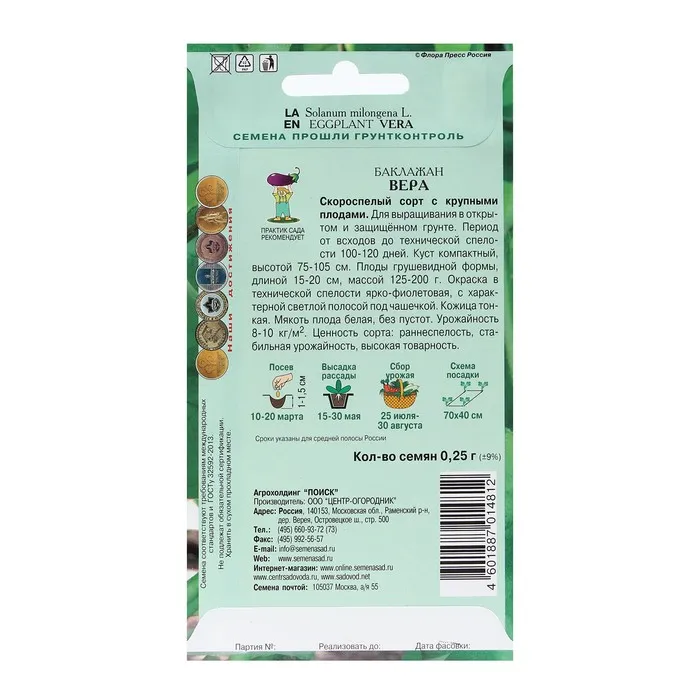 Скороспелый сорт с крупными плодами. Для выращивания в открытом и защищенном грунте. Период от всходов до технической спелости 100-120 дней. Куст компактный, высотой 75-105 см. Плоды грушевидной формы, длиной 15-20 см, массой 125-200 г. Окраска в технической спелости ярко-фиолетовая, с характерной светлой полосой под чашечкой. Кожица тонкая. Мякоть плода белая, без пустот. Урожайность 8-10 кг/м2. Ценность сорта раннеспелость, стабильная урожайность, высокая товарность.