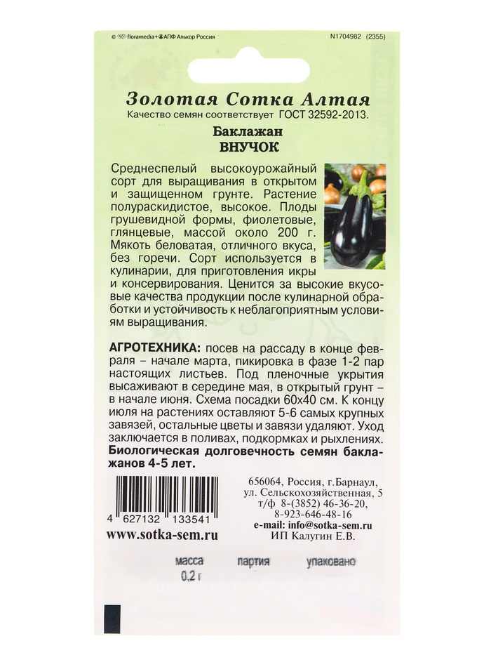 Семена Баклажан «Внучок», 0.2 г, среднеспелый, грушевидный «Золотая Сотка Алтая» — Характеристики