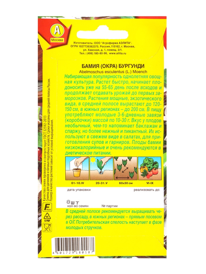 Семена Бамия «Бургунди», 8 шт., скороспелая, «Аэлита» — Характеристики