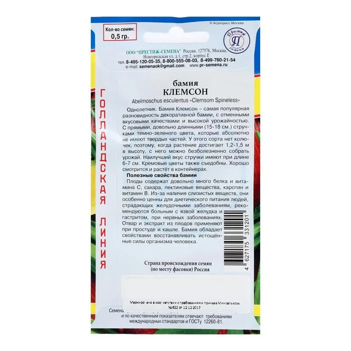 Однолетник. Бамия Клемсон самая популярная разновидность декоративной бамии, с отменными вкусовыми качествами и высокой урожайностью. С прямыми, довольно длинными (15-18см) стручками темно-зеленого цвета, которые абсолютно не имеют твердых частей.