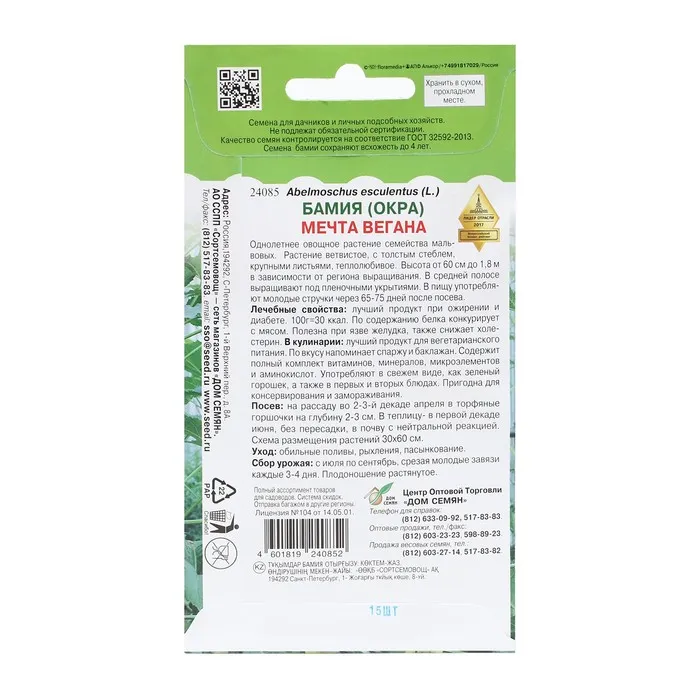 Однолетнее овощное растение семейства мальвовых. Растение ветвистое, с толстым стеблем, крупными листьями, теплолюбивое. Высота от 60 см до 1,8 м в зависимости от региона выращивания. В средней полосе выращивают под пленочными укрытиями. В пищу употребляют молодые стручки через 65-75 дней после посева. Лечебные свойства: лучший продукт при ожирении и диабете. 100г=30 ккал. По содержанию белка конкурирует с мясом. Полезна при язве желудка, также снижает холестерин. В кулинарии: лучший продукт для вегетарианского питания. По вкусу напоминает спаржу и баклажан. Содержит полный комплект витаминов, минералов, микроэлементов и аминокислот. Потребляют в свежем виде, как зеленый горошек, а также в первых и вторых блюдах. Пригодна для консервирования и замораживания.
