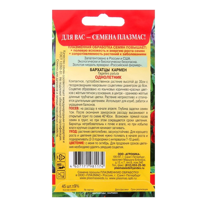 Посев:: на рассаду в начале апреля. Глубина заделки семян 1см. После окончания заморозков рассаду высаживают в открытый грунт по схеме 40*40см. Возможен прямой посев семян в грунт, но при этом сокращаются сроки цветения. Бархатцы нетребовательны к почве и влаге, но при избытке влаги крупные соцветия начинают загнивать.