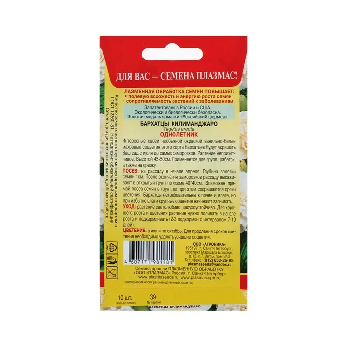 Посев: на рассаду в начале апреля. Глубина заделки семян 1см. После окончания заморозков рассаду высаживают в открытый грунт по схеме 40*40см. Возможен прямой посев семян в грунт, но при этом сокращаются сроки цветения. Бархатцы нетребовательны к почве и влаге, но при избытке влаги крупные соцветия начинают загнивать.
