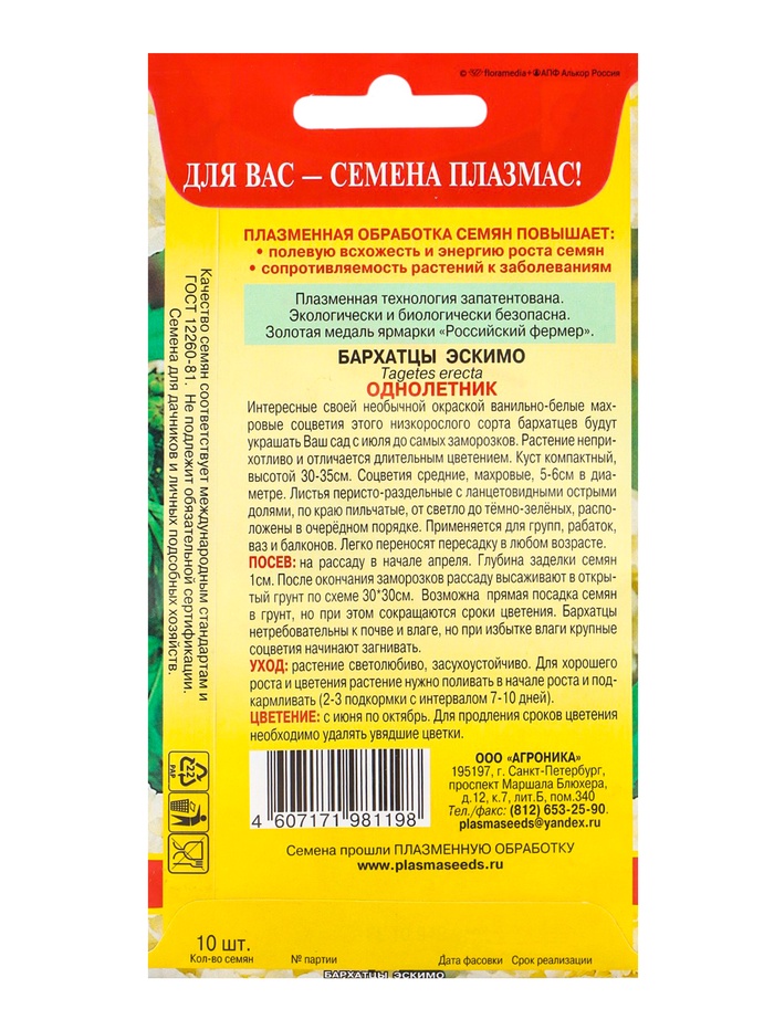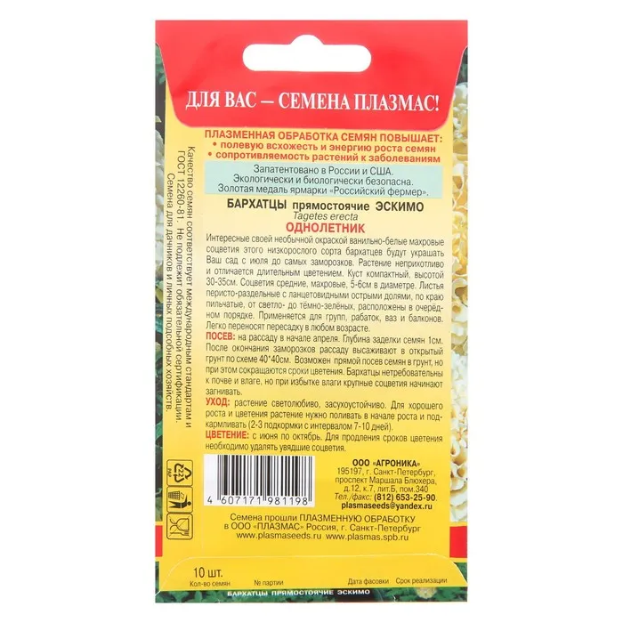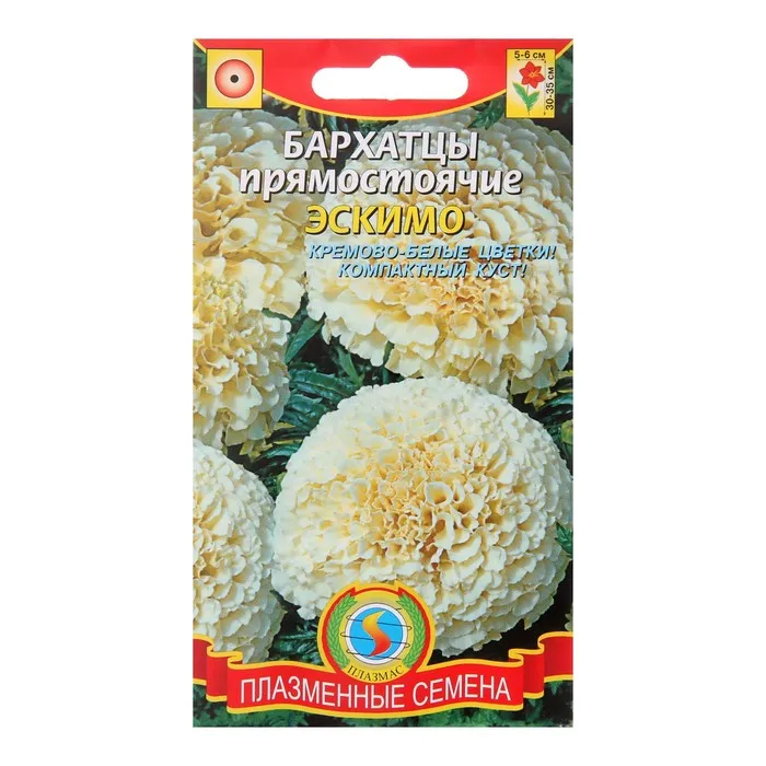 "Сорт с необычной, ванильно-белой окраской соцветий. Формирует низкорослые, компактные кусты высотой 30-35 см. Соцветия густомахровые, крупные – 5-7 см. Цветение раннее, обильное и продолжительное. Растения неприхотливые, светолюбивые и относительно засухоустойчивые. Используются на клумбах и в рабатках, в бордюрах вдоль дорожек. Хорошо растут в ограниченном