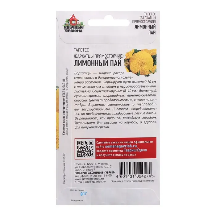 Соцветия крупные (8-10 см в диаметре) густомахровые, шаровидные, лимонно-желтой окраски. Цветет продолжительно, с июня по сентябрь. Бархатцы светолюбивы и теплолюбивы, засухоустойчивы.