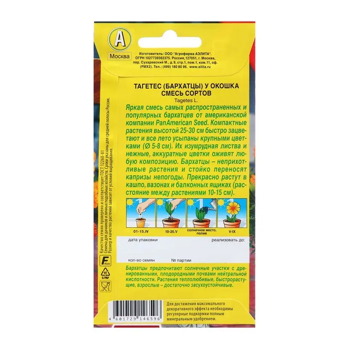 Семена Бархатцы У окошка, смесь сортов Одн Цветущий балкон Ц/П 7 шт. — Характеристики