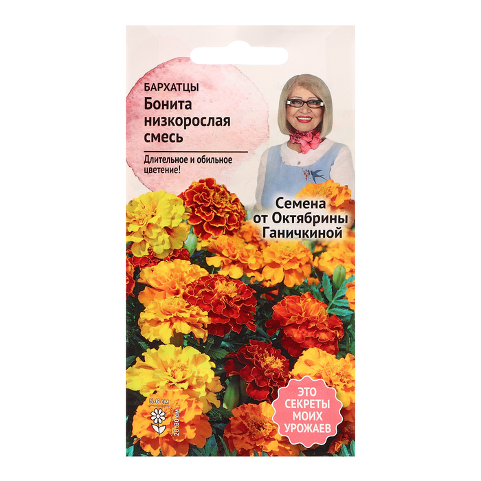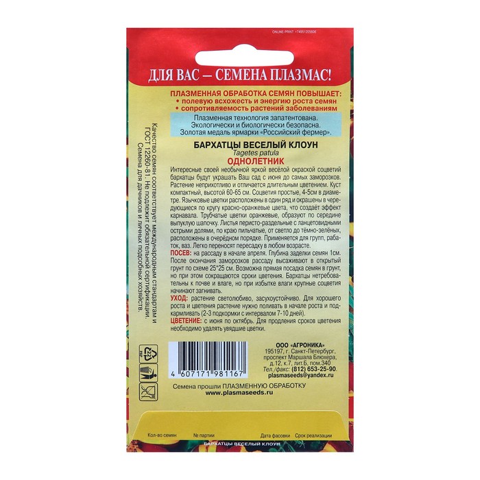 Бархатцы «Весёлый клоун» имеют яркие соцветия, которые будут украшать ваш сад с июня до самых заморозков. Растения образуют компактный куст высотой 60–65 см.