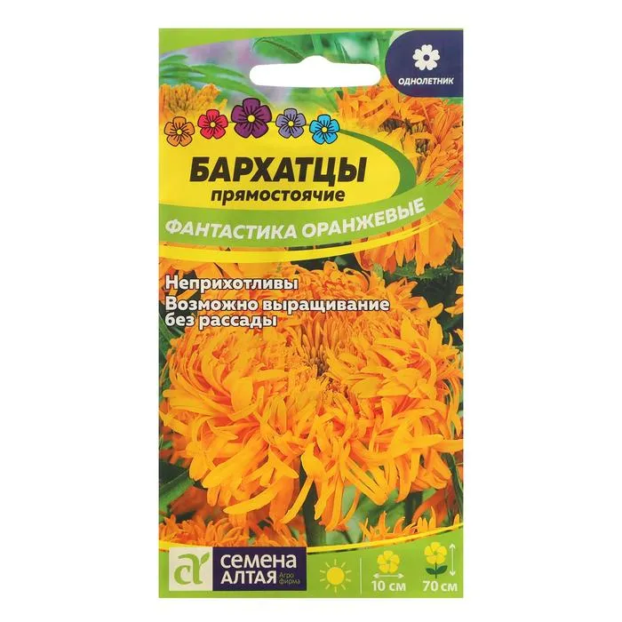 ПОСЕВ: на рассаду в начале апреля. Глубина заделки семян 1см. После окончания заморозков рассаду высаживают в открытый грунт по схеме 40х40 см. Возможна пря- мая посадка семян в грунт, но при этом сокращаются сроки цветения. Бархатцы нетребовательны к почве и влаге.