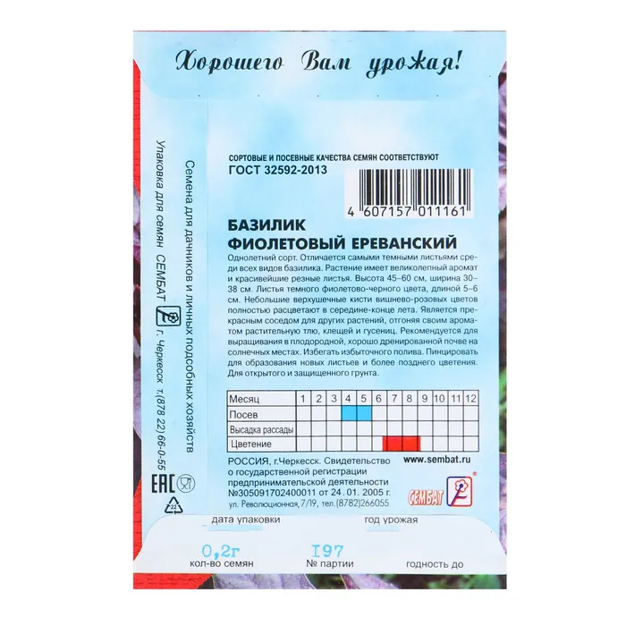 Растение среднеспелое, сильноветвистое с четырехгранными стеблями высотой 40-60см, содержит много эфирных масел и каротина. Масса одного растения 25-35 г. Лист черешковый, среднего размера, широкояйцевидной формы, с редко зубчатым краем, темно-фиолетового цвета. Цветки сиреневые. Очень ароматный. Рекомендован для использования в свежем и сушеном виде в качестве приправы, а также при засолке и консервировании. Базилик эффективно применяют при заболеваниях желудка, воспалении мочевого пузыря, кашле, для заживления ран.