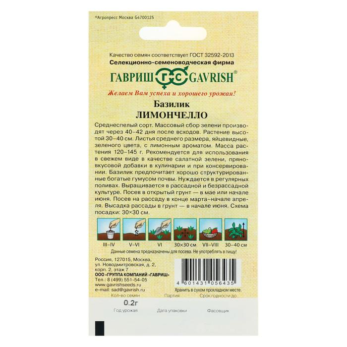 Среднеспелый сорт. Массовый сбор зелени производят через 40-42 дня после всходов. Растение высотой 30-40 см. Листья среднего размера, яйцевидные, зеленого цвета, с лимонным ароматом. Масса растения 120-145 г. Рекомендуется для использования в свежем виде в качестве салатной зелени, пряно-вкусовой добавки в кулинарии и при консервировании. Базилик предпочитает хорошо структурированные, богатые гумусом почвы. Нуждается в регулярных поливах. Выращивается в рассадной и безрассадной культуре. Посев в открытый грунт — в мае или начале июня. Посев на рассаду в конце марта — начале апреля. Высадка рассады в грунт - в начале июня. Схема посадки: 30х30 см.