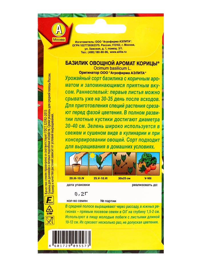 Семена Базилик овощной «Аромат корицы», 0.2 г, ранний, «Аэлита» — Характеристики
