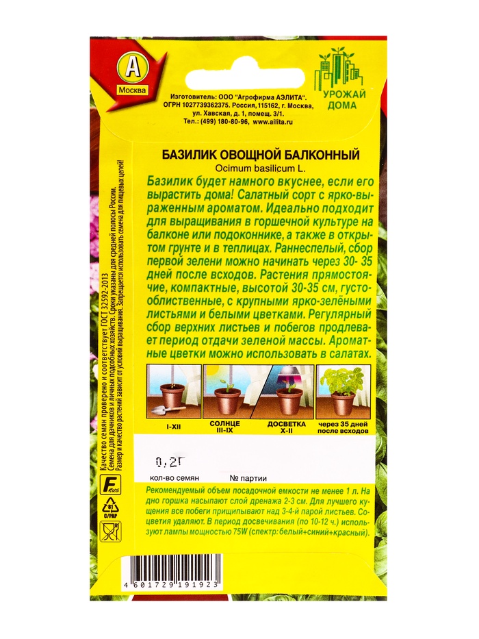 Семена Базилик овощной «Балконный», 0.2 г, крупнолистный, «Аэлита» — Характеристики