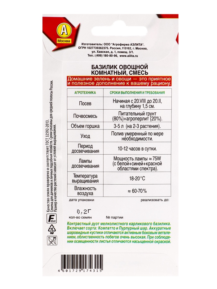 Семена Базилик овощной «Комнатный», смесь, 0.2 г, «Аэлита. Зимний огород» — Характеристики