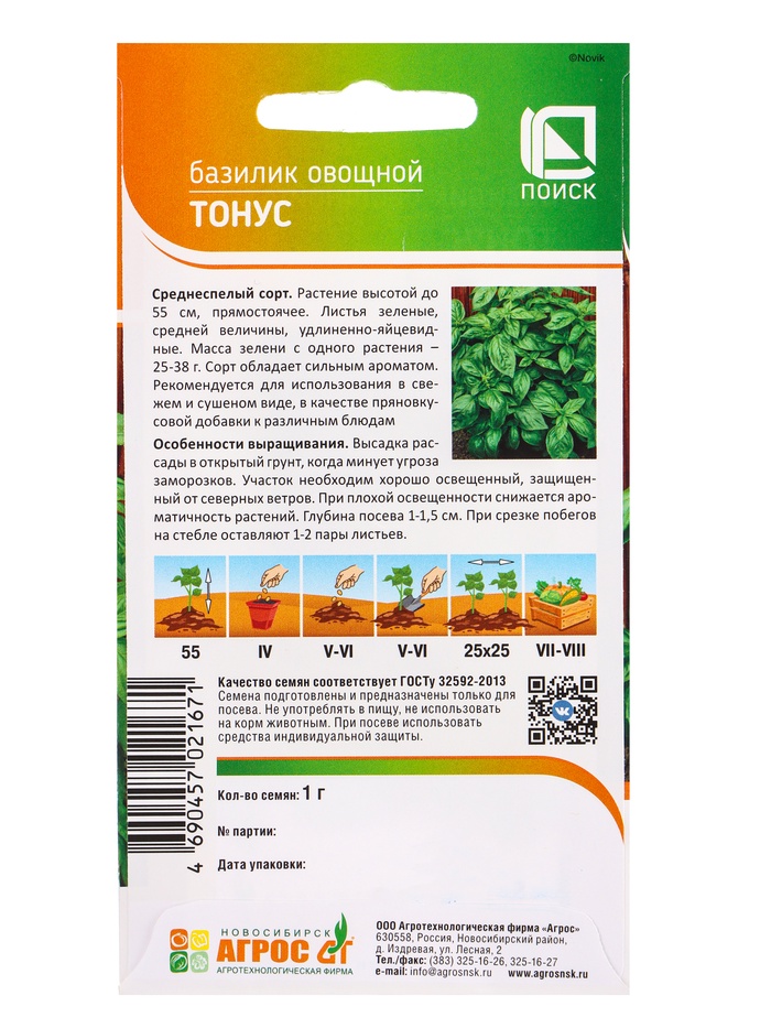 Семена Базилик овощной «Тонус», 1 г, «Агрос»