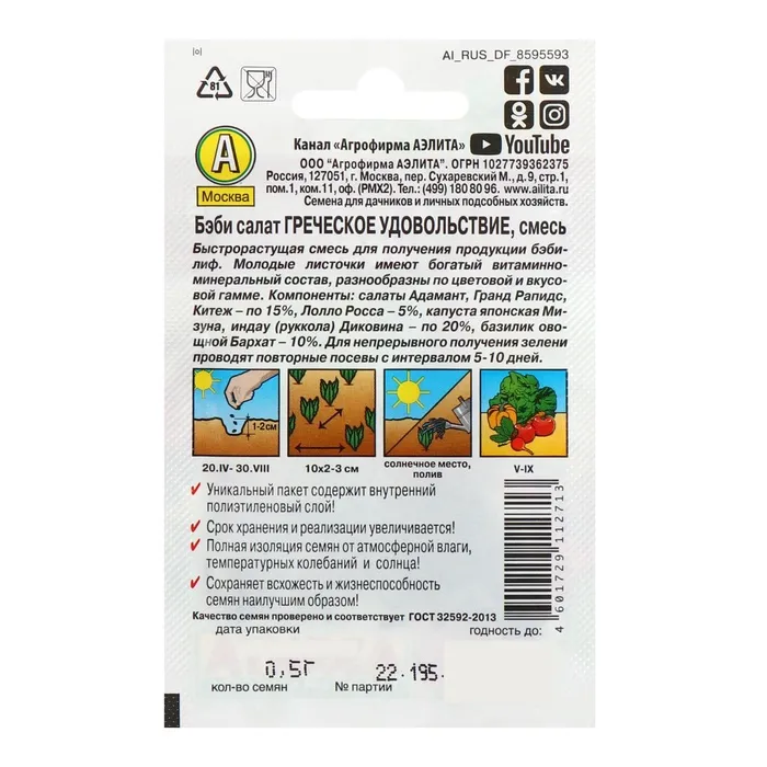 «Греческое удовольствие» представляет собой смесь быстрорастущих сортов молодого салата. Листочки богаты витаминами и минералами, отличаются по цвету и вкусу.