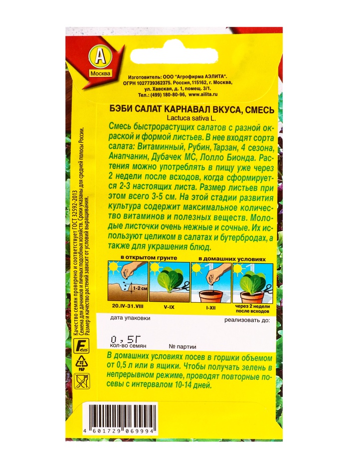 Семена Бэби салат «Карнавал вкуса», смесь, 0.5 г, «Агрофирма АЭЛИТА» — Характеристики
