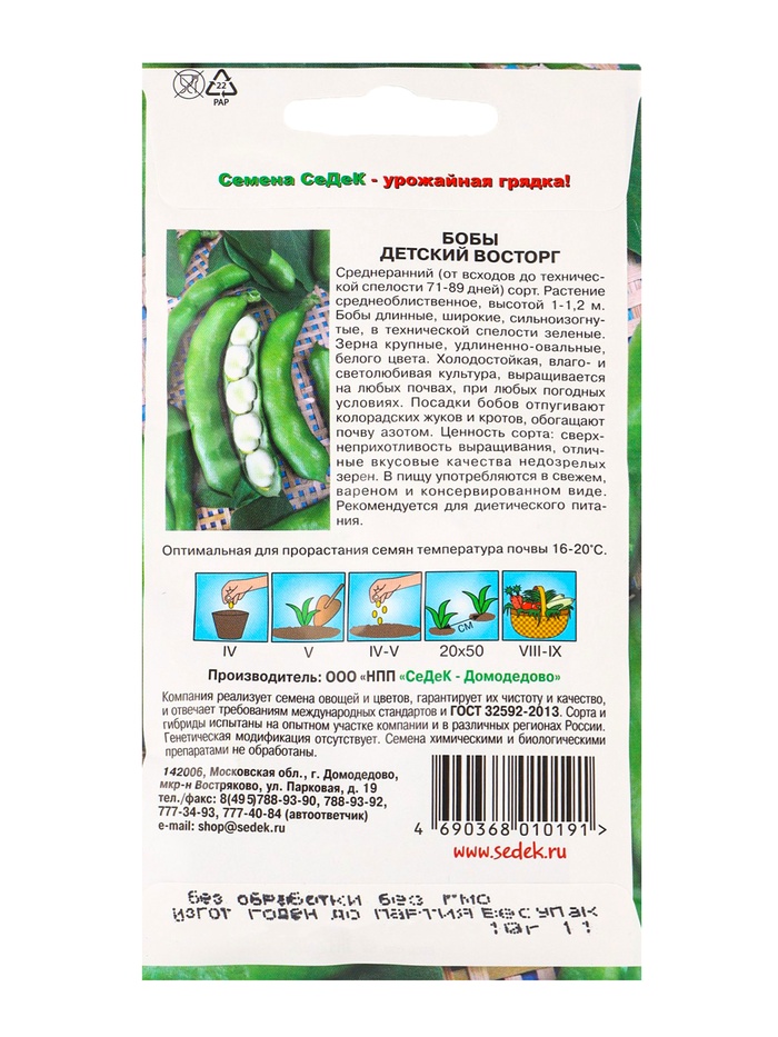 Среднеранний (от всходов до технической спелости 71-89 дней) сорт. Растения среднеоблиственные, высотой 1-1,2 м. Бобы длинные, широкие, сильноизогнутые, в технической спелости зеленые. Зерна крупные, удлиненно-овальные, белого цвета. Холодостойкая, влаго- и светолюбивая культура, выращивается на любых почвах, при любых погодных условиях. Посадки бобов отпугивают колорадских жуков и кротов, обогащают почву азотом. Ценность сорта: сверхнеприхотливость выращивания, отличные вкусовые качества недозрелых зерен. В пищу употребляются в свежем, вареном и консервированном виде. Рекомендуется для диетического питания.