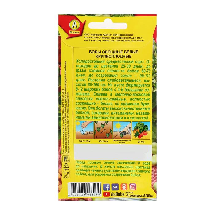 Семена овощных бобов «Белые» — среднеспелый холодостойкий сорт. От всходов до полного созревания семян проходит от 90 до 110 дней, до потребительской спелости молодых бобов — 40 или 50 дней.
