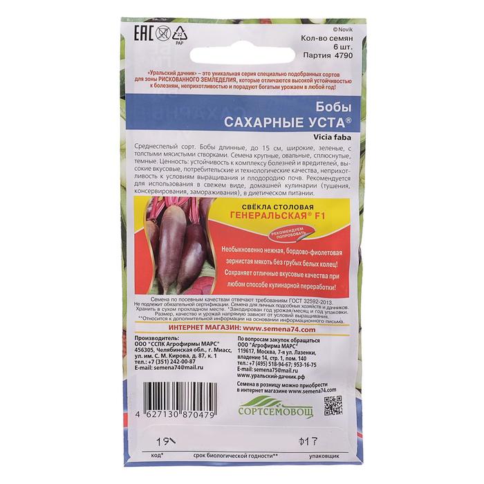 Среднеспелый сорт. Бобы длинные, до 15 см, широкие, зелёные, с толстыми мясистыми створками. Семена крупные, овальные, сплюснутые, белые.