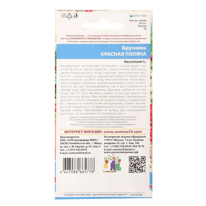 Вечнозеленый многолетний стелющийся полукустарник, высотой 25-30 см. Листья кожистые, темно-зеленые, блестящие, цветки бледно-розовые. Ягоды округлые, светло-красные, массой 0,5 г, кисло-сладкого, освежающего вкуса. С одного куста можно получить до 600 гр. ягод. Многочисленные плоды брусники обладают огромным запасом витаминов и могут использоваться как для консервирования, так и для потребления в свежем виде.Для выращивания брусники требуются кислые почвы (рН-3,5–4,5). Высевать семена на рассаду можно под зиму или рано весной. При посеве необходима стратификация, для этого семена помещают во влажный песок и выдерживают 3 месяца на нижней полке холодильника. Семена высеваются по поверхности, не заделываются. В фазе 2-4 настоящих листьев сеянцы пересаживают в школку, для доращивания, после чего их высаживают на постоянное место.