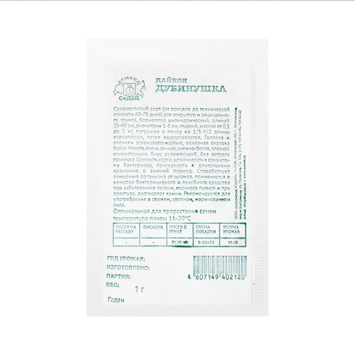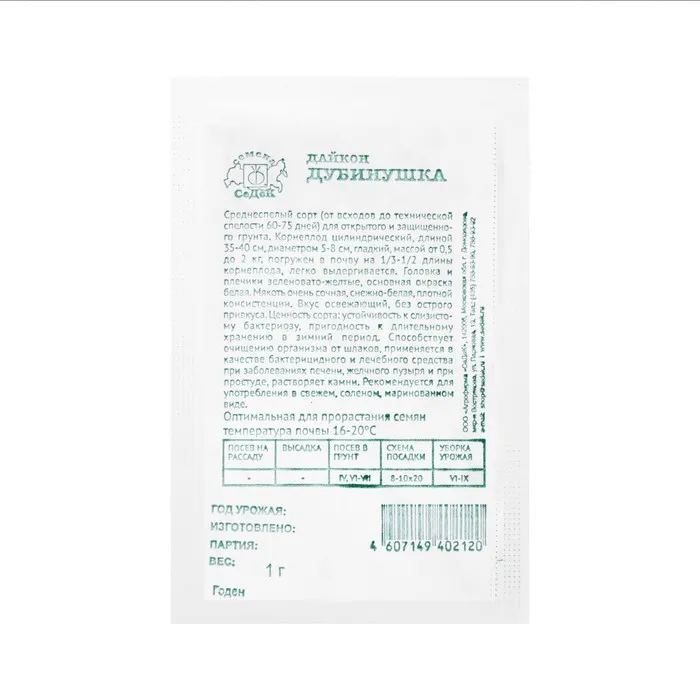 Среднеспелый (60-75 дней от всходов до технической спелости) сорт. Корнеплод цилиндрический, длиной 35-40 см, диаметром 5-8 см, гладкий, головка и плечики слегка зеленовато-желтые, основная окраска белая. Мякоть очень сочная, нежная, снежно-белая, плотной консистенции, погруженность в почву на 1/3—1/2 длины корнеплода, легко выдергивается. Масса корнеплода 570-2200 г. Вкус хороший, освежающий, сладковатый, без острого привкуса. Относительно устойчив к слизистому бактериозу. Пригоден для длительного хранения в зимний период. Выращивается в открытом и защищенном грунте. Посев проводят в два срока –в конце апреля или во второй половине июля по схеме 8-10 х 20 см. Урожайность 5-7,5 кг/м2.