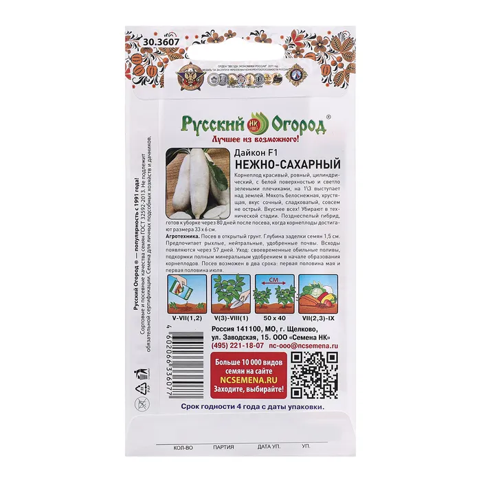 Позднеспелый гибрид с красивыми, крупными и очень вкусными корнеплодами! Белоснежная, хрустящая, сочная сладковатая мякоть понравится всем, включая детей. Самый вкусный из всех дайконов, которые мы пробовали! Хорошо во любом виде: свежем, отварном и вареном, жареном, запеченом и маринованном. Ровный цилиндрический корнеплод со светло-зелеными плечиками достигает размеров 33 х 6 см, выступая над поверхностью земли на 1/3. Урожай собирают через 80 дней после посева. Долго хранится без потери вкуса и качества. Сроки посева - середина-конец июля.