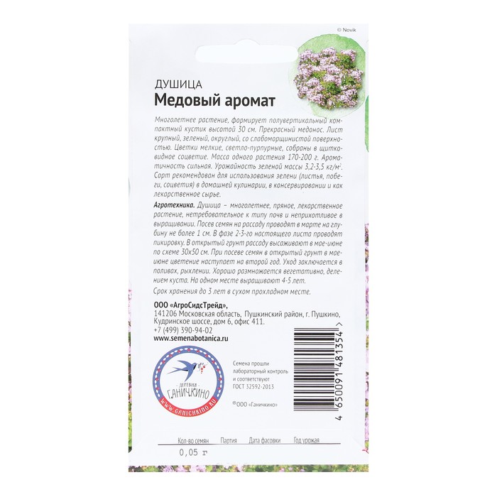 Агротехника: Душица – многолетнее, пряное, лекарственное растение, не требовательное к типу почв и неприхотливое в выращивании. Посев семян на рассаду проводят в марте на глубину не более 1 см. В фазе 2-3-его настоящего листа проводят пикировку. В открытый грунт рассаду высаживают в мае - июне по схеме 30×50 см. При посеве семян в открытый грунт в мае – июне цветение наступает на второй год. Уход заключается в поливах, рыхлении. Хорошо размножается вегетативно, делением куста. На одном месте выращивается 4-5 лет.