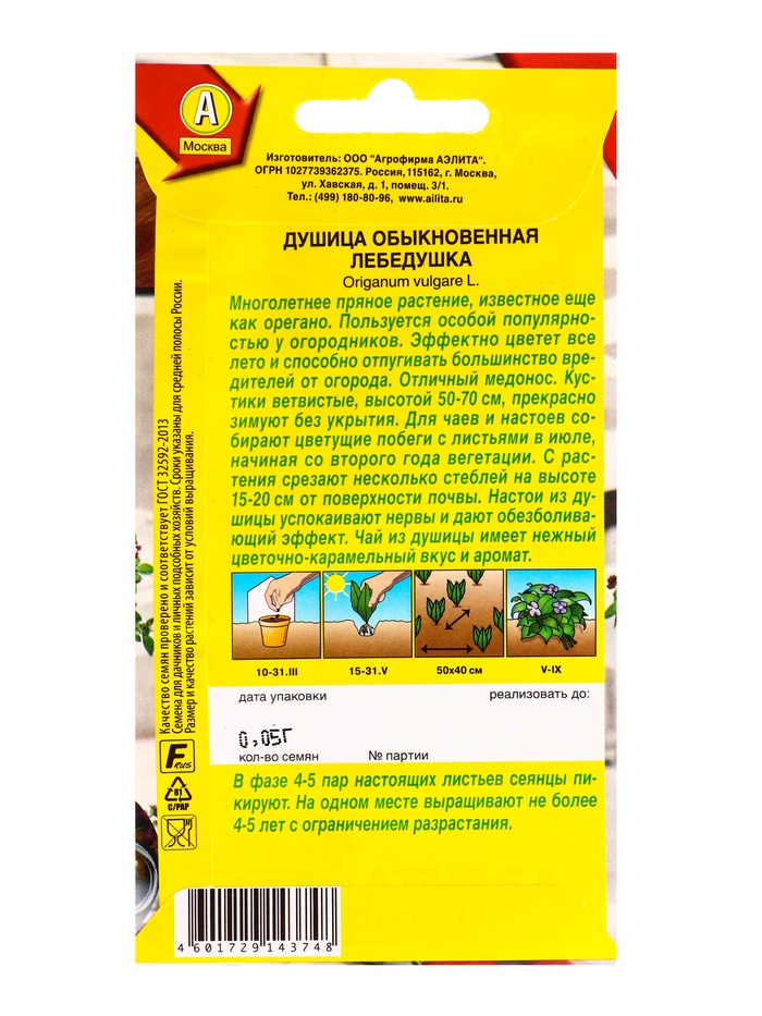 Семена Душица обыкновенная «Лебедушка», 0.05 г, «Аэлита» — Характеристики
